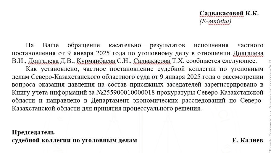 On December 5, 2024, the Specialized Interdistrict Criminal Court of the North Kazakhstan Region, with a jury, fully acquitted the Dolgalevs, Kurmanbayev, and Sadvakassov. During that trial, unlawful actions by investigators were exposed. State prosecutor Timur Kulzhanov later stated in an appeal that jurors had reported being pressured — not by the defendants’ lawyers or relatives seeking an acquittal, but by investigative authorities attempting to secure a guilty verdict.
