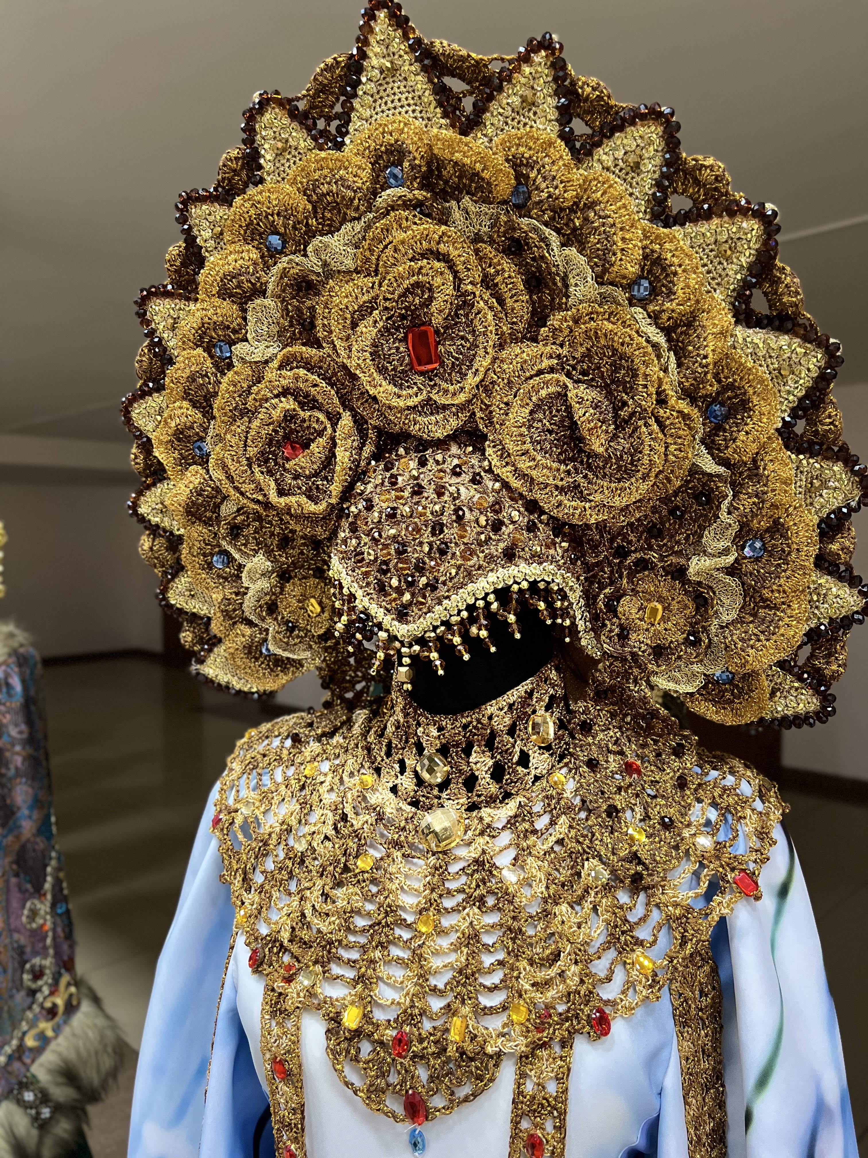 One section features fur cloaks and patterned headdresses that echo early human life. Others display elaborate embroidered gowns in blue and green, adorned with rhinestones, gold trim, and hand stitching.