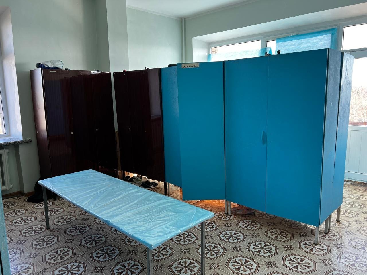 In the procedure room, an old, broken operating table sits under a rubber sheet. Nurses use metal sterilization boxes that look like relics. The walls are chipped, doors have been repainted countless times, and windows are covered not with blinds but with medical sheets.