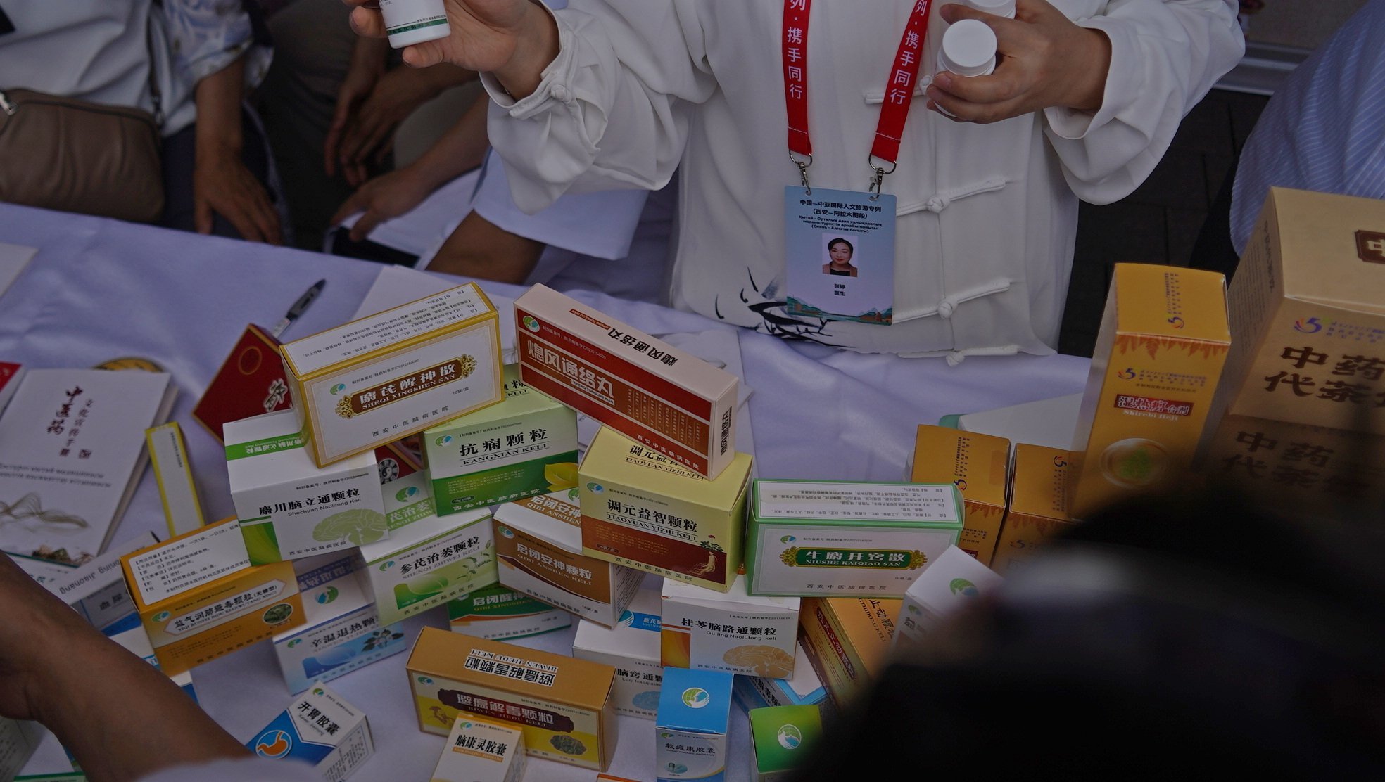 One of the more popular areas among the elderly visitors was a section featuring traditional and other forms of Chinese medicine. Crowds gathered around a counter where a young man explained the intended health benefits of various products in basic Russian.