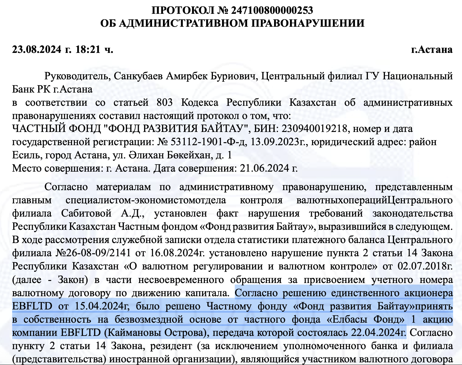 According to the National Bank of Kazakhstan, the fine was issued after Nazarbayev’s Elbasy Fund transferred one share of EBF LTD, a Cayman Islands–registered company, to the Baitau Fund on April 22, 2024.