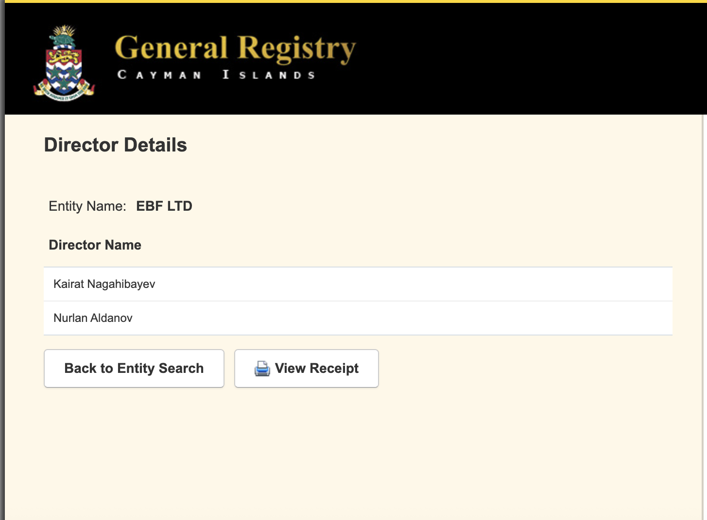 The National Bank said the matter did not fall under its regulatory mandate. So we turned to the Cayman Islands’ corporate registry. There we found the company. From the filings, we learned its office address, its charter capital — just $49,500 — and the names of two directors: Kairat Nagahibayev and Nurlan Aldanov.