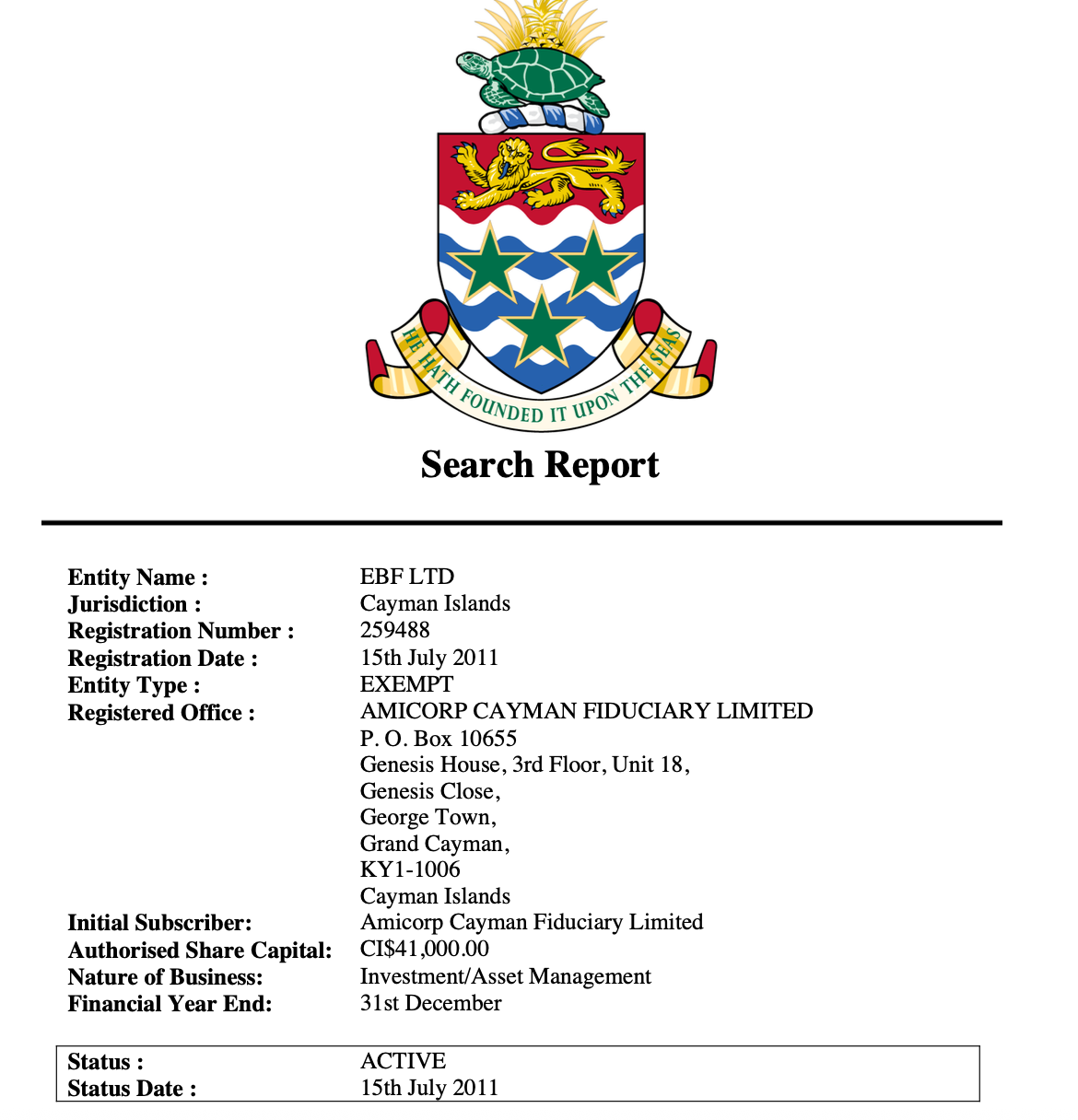 EBF LTD itself was registered on July 15, 2011, as an Exempt Company.