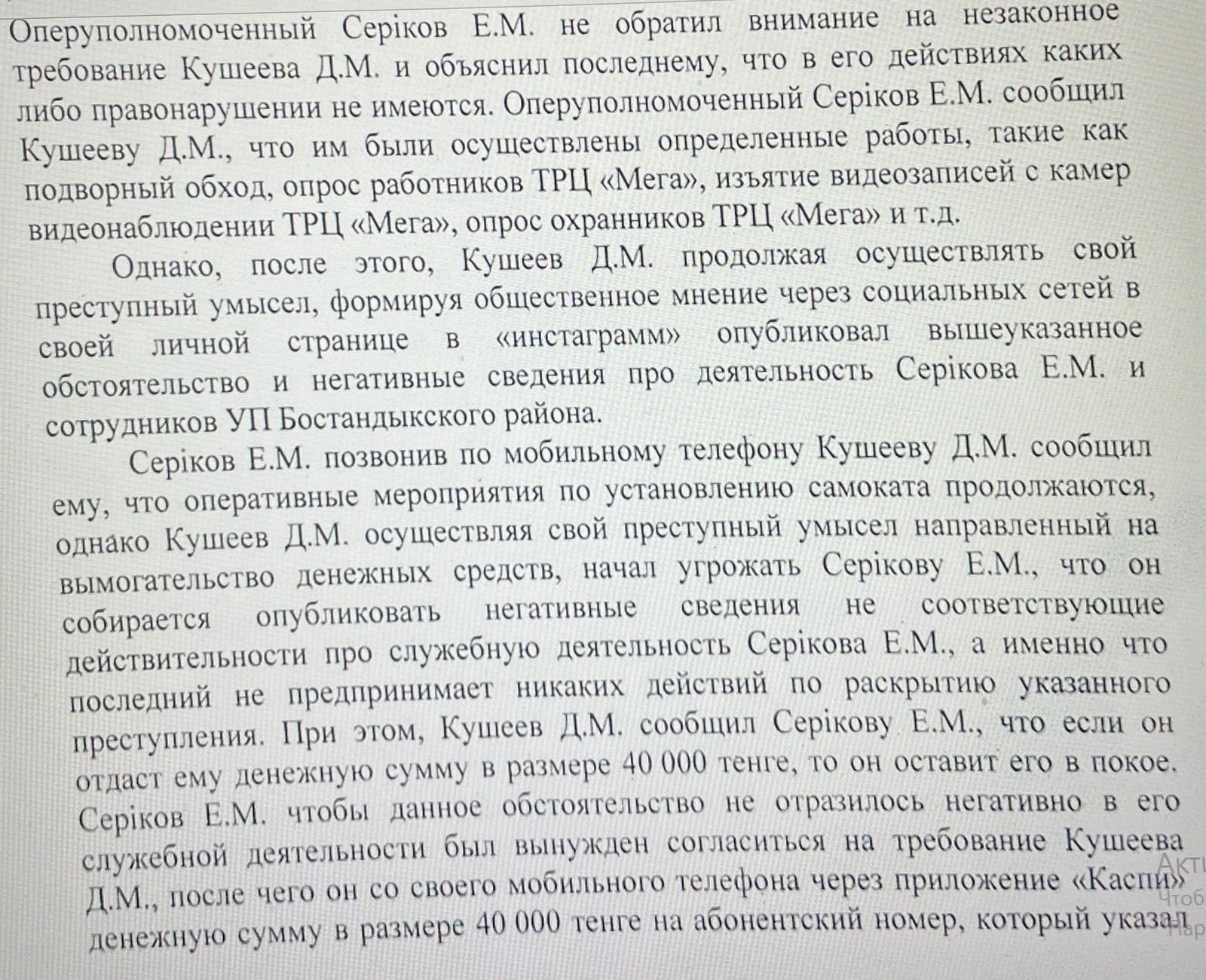 I don't understand how this case even got to court? The man hid the fact that he was being extorted for months, and then suddenly reported it. As a police officer, he should have filed a report immediately. Then there wouldn't have been any questions for him. When I learned that Serikov filed a report against me in February 2025, I responded on July 9th by writing to the Prosecutor General's Office asking for him to be questioned in my presence. My lawyer and I requested the case file on the scooter theft, but they refused because I wasn't a party to the criminal proceedings. In my opinion, no investigation into the theft was ever conducted. I heard that it was archived on October 9th, 2023.