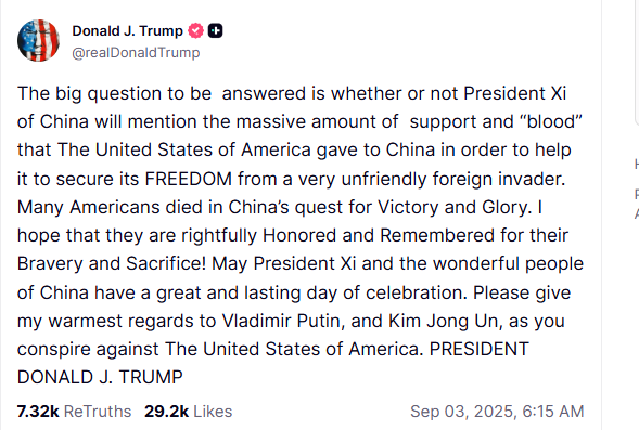 On September 3, immediately after the start of the parade in Beijing, U.S. President Donald Trump posted on Truth Social, Orda.kz reports.