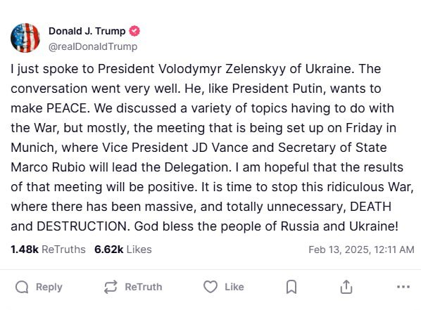 Regarding his subsequent call with Zelenskyy, Trump confirmed having "a successful conversation" where both leaders expressed their desire to achieve peace, and mentioned an upcoming important meeting in Munich on February 14.