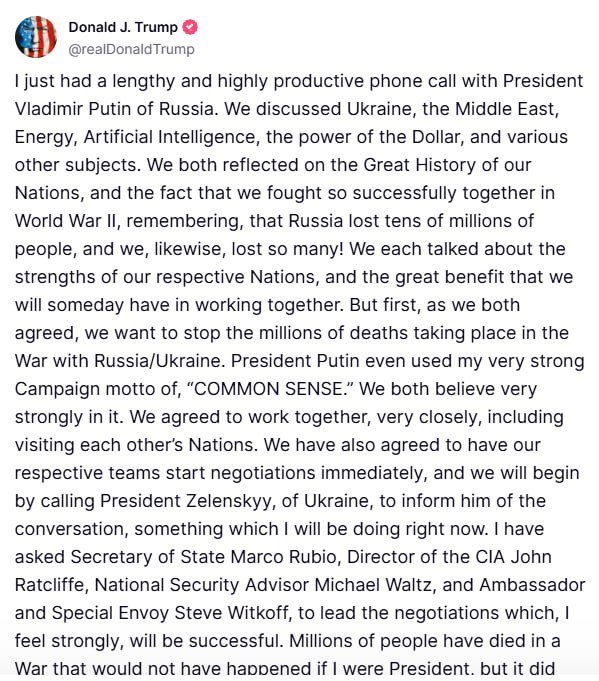 I just spoke with Donald Trump. About the possibility of achieving peace. About our readiness to work together at the team level. About our technological capabilities, our drones and other modern production. Trump informed me about the details of his conversation with Putin. Ukraine wants peace more than anyone. We are determining our common steps with the US to stop Russian aggression and guarantee reliable, lasting peace. As President Trump said, let's get it done.