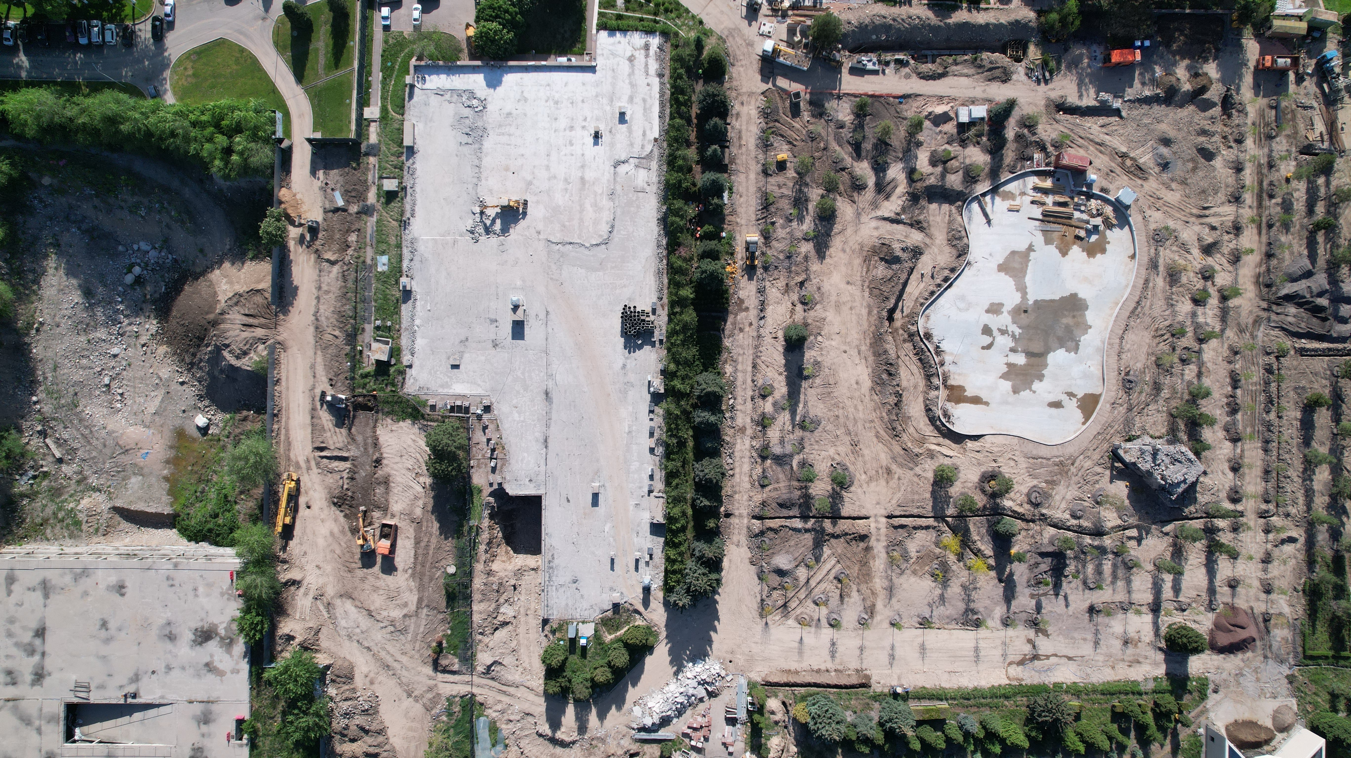 The remains of a concrete structure can be seen northeast of the pool. Compared to April, its size has significantly decreased. It is likely to be completely demolished before the park opens.