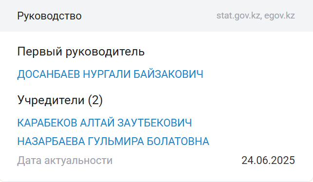 Founded in 2019, the company originally listed Nurgali Dosanbayev as its first director and Altay Karabekov as its sole founder. Just days later, Gulmira Bolatovna joined as a co-founder.
