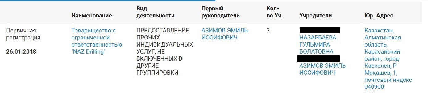 In 2018, a company named NAZ DRILLING was registered, specializing in geological exploration. Its director is Emil Azimov, while Gulmira Nazarbayeva once again appears as a co-founder.