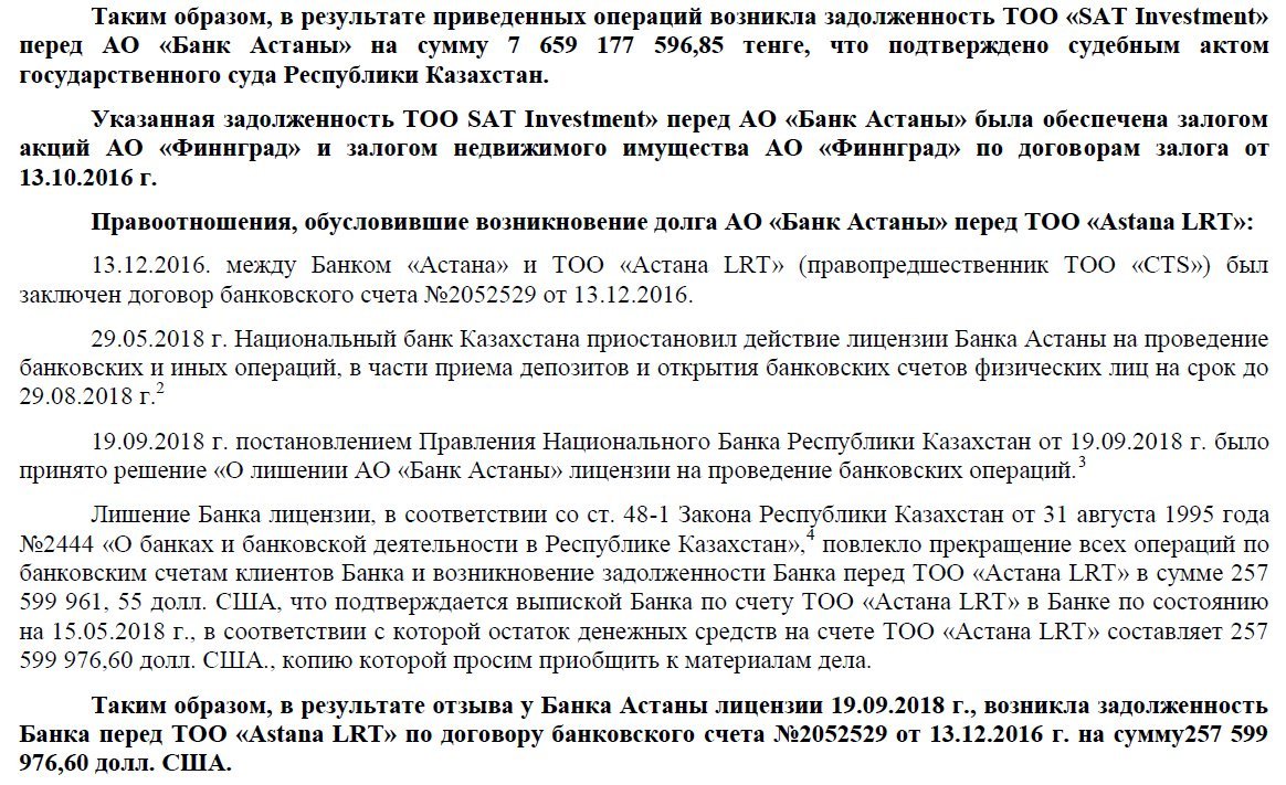 To resolve these financial messes, Bank Astana transferred both SAT Investment’s debt and Astana LRT’s frozen funds to the state-owned Problem Loans Fund. That’s how CTS ended up owning the Finngrad collateral.