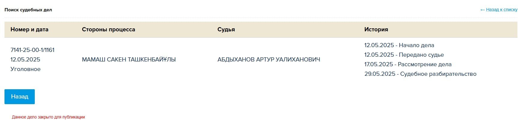The case has been marked as closed to the public in the “Court Office” system. The Astana judicial administration has not provided a reason.
